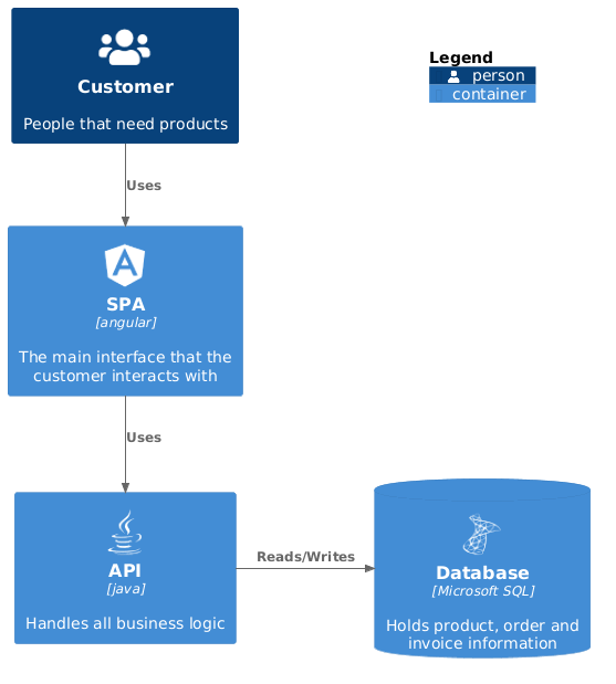 Container(spa, "SPA", "angular", "The main interface that the customer interacts with", $sprite="angular")