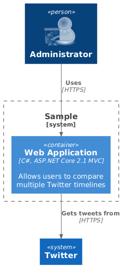 Container(web_app, "Web Application", "C#, ASP.NET Core 2.1 MVC", "Allows users to compare multiple Twitter timelines")