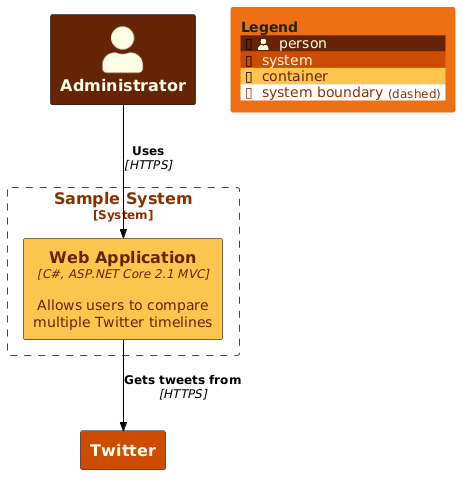 Container(web_app, "Web Application", "C#, ASP.NET Core 2.1 MVC", "Allows users to compare multiple Twitter timelines")